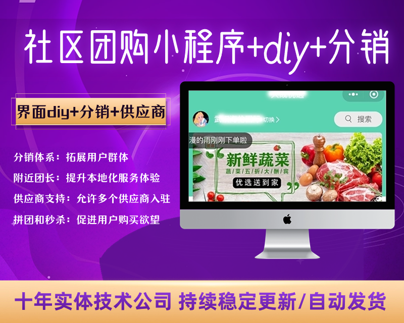 文章标题:社区团购小程序+界面diy+分销+附近团长+供应商+拼团+菜谱+秒杀+预售+配送+直播【C152】