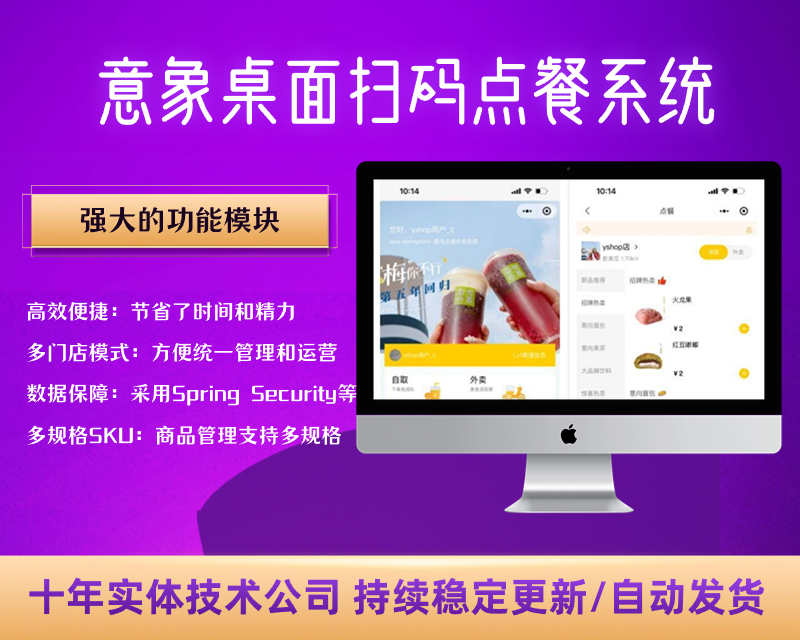 意象点餐(扫码点餐)系统,在线点餐(外卖与自取)小程序模式,支持多门店模式,基础技术Java,uniapp(vue3)(支持H5、微信小程序) 采用当前流行技术组合的前后端分离点餐系统: SpringBoot、Spring Security OAuth2、MybatisPlus、SpringSecurity、jwt、redis、Vue3的前后端分离的系统, 包含外卖与自取、商品管理(多规格sku)、店铺管理、云小票打印、图片素材库、订单管理、积分兑换、充值、优惠券、充值、多门店、微信公众号、门店移动端、分销商、桌面扫码点餐、拼团、邀请有礼、会员卡等功能,更适合企业或个人二次开发.