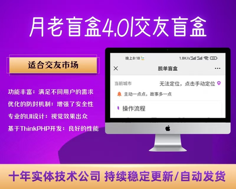 一款使用thinkphp开发的盲盒源码,4.0新版本主要是对防封防红做了很大的优化,功能也加了很多。这套源码比以前分享的盲盒源码多了默契匹配、同城匹配、随机匹配、星座匹配模式,源码的UI样式设计的也是非常专业漂亮的.